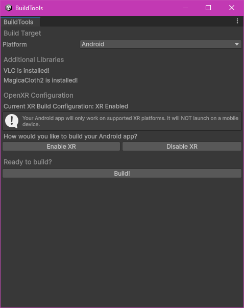 The BuildTools editor window allows developers to quickly and easily prepare the Unity project for building Hypernex.Unity. Simply all you do, once you open the project, is open the window under Hypernex > BuildTools. From here, BuildTools will automatically start configuring your project based on any extra libraries you have. Once done compiling, it will prompt what kind of build you want to make. Whenever you make your selection, building is as simple as clicking the build button.